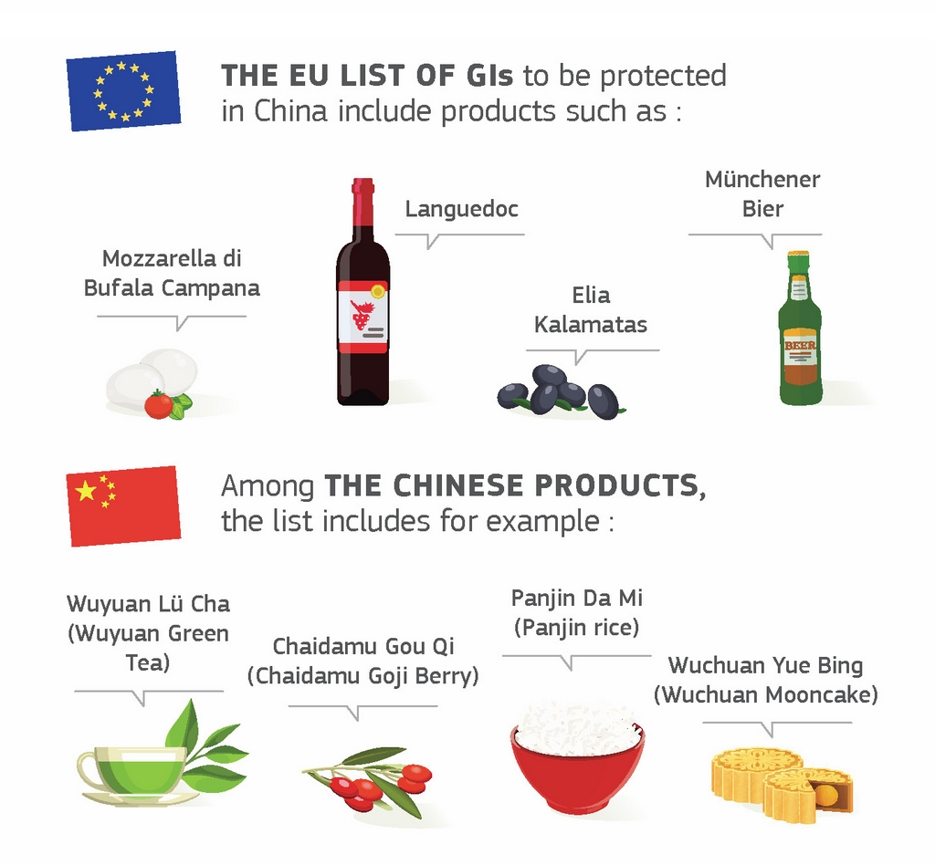 Na seznamu zeměpisných označení EU, jež budou v Číně chráněna, jsou produkty jako Cava, Champagne, Feta, Irish Whiskey, Münchener Bier, Ouzo, Polska Wódka, Porto, Prosciutto di Parma a Queso Manchego. Mezi čínské výrobky zase patří například Pixian Dou Ban (fazolová pasta Pixian), Anji Bai Cha (bílý čaj Anji), Panjin Da Mi (rýže Panjin) a Anqiu Da Jiang (zázvor Anqiu). Nechybí ani česnek, goji, zelenina, ale také hlízy, škeble, fazolové klíčky, lotosový ořech, raci či jačí maso. Pro někoho překvapivě je na seznam zařazena čtveřice označení pro čínská vína: